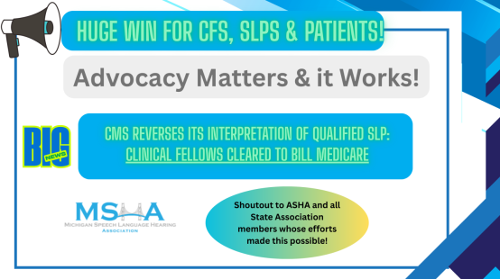 CMS Reverses its interpretation of qualified SLP: Clinical Fellows cleared to bill Medicare. Thank you for all your support!