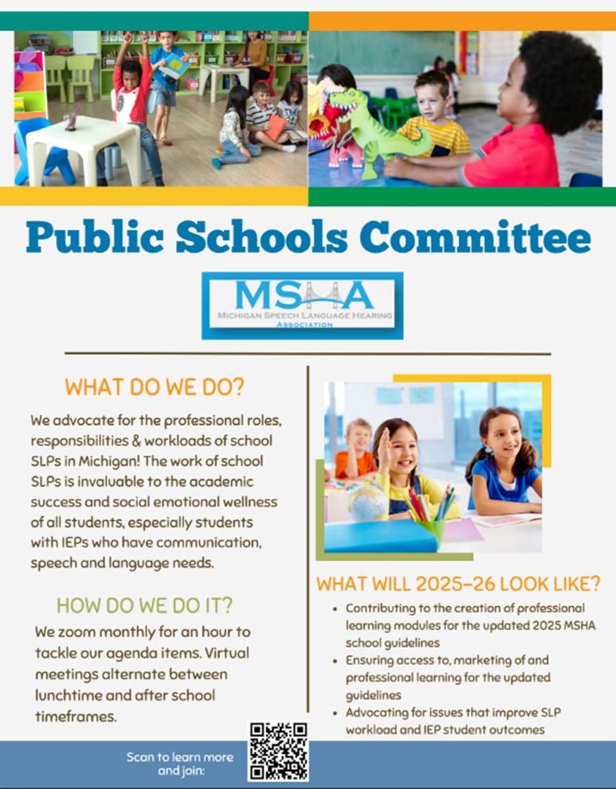 The purpose of the Committee on Public Schools (PSC) is to support, represent and advocate for public school personnel affiliated with the Michigan Speech-Language-Hearing Association (MSHA).